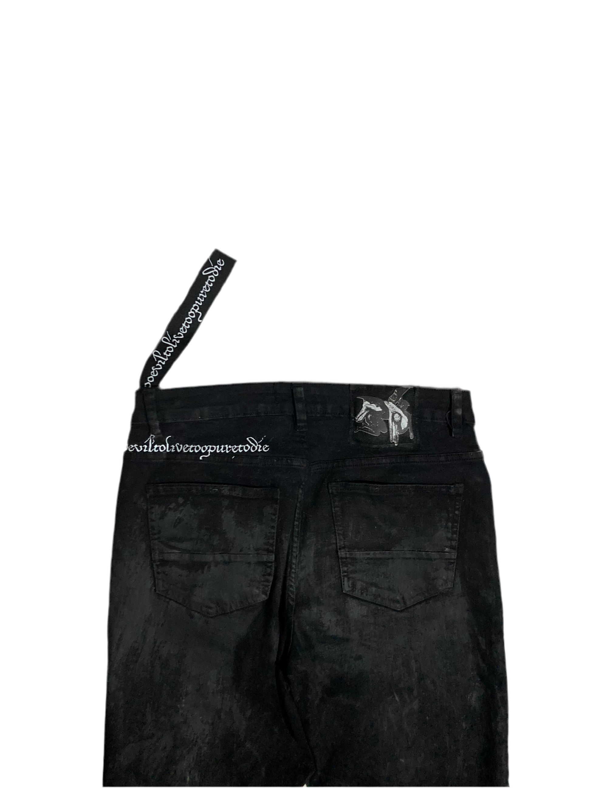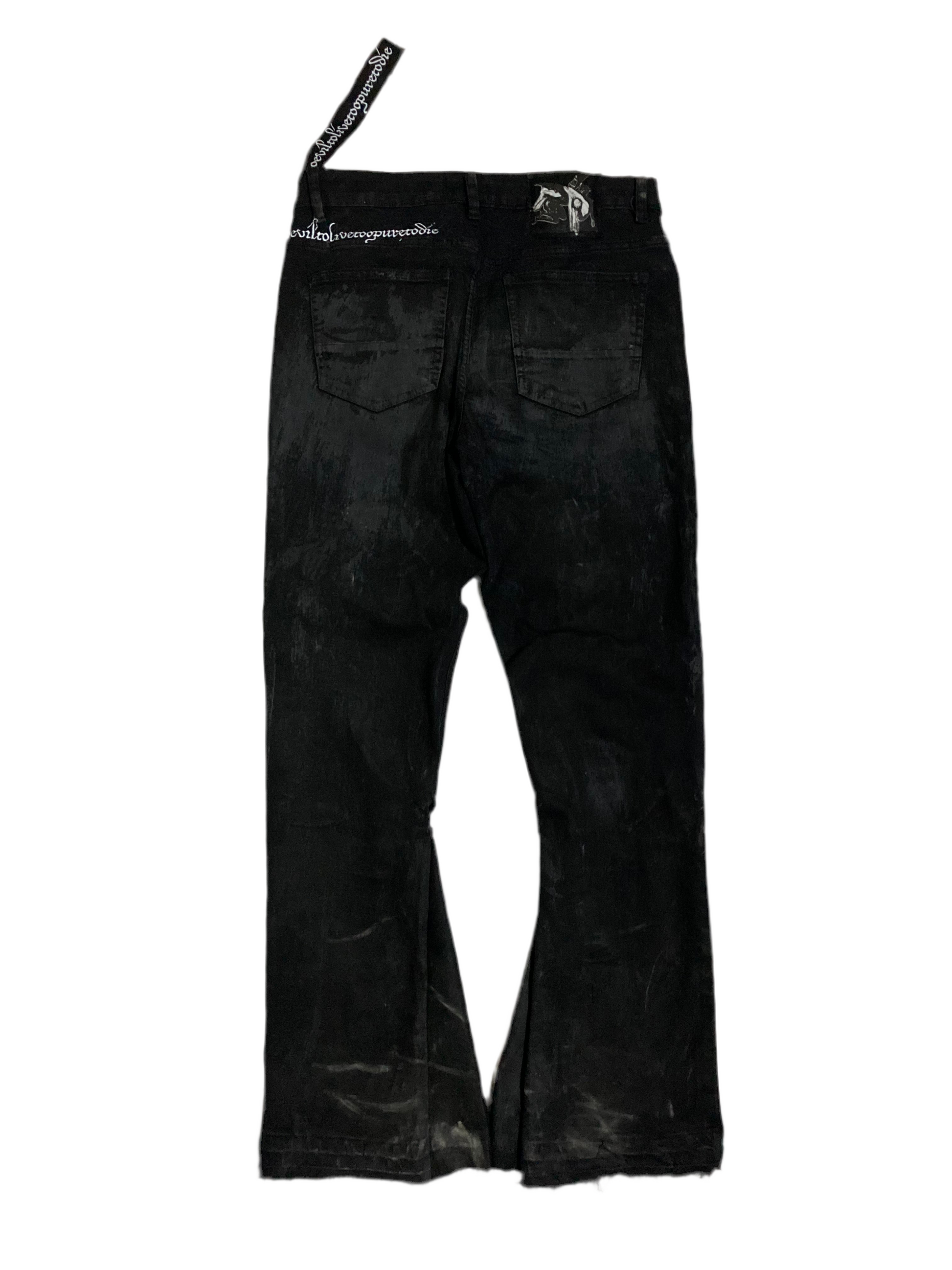 The Alaska Denim Jeans are made from locally sourced Lightweighg breathable Denim , which has been exaggerated with bootcut/flared slits . The Denim is washed by hand with the same Paint solution as the Jacket which is still glossy ,dirty and messy . A cold water bath with an air dry is reccomend for washing or regular spot cleaning is good . Denim Fits true to size